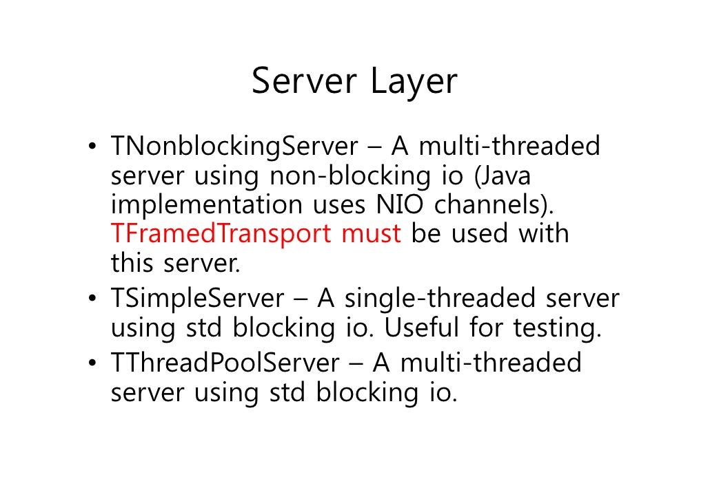 48. 48. Server Layer• TNonblockingServer – A multi-threaded server using non-blocking io (Java implementation uses NIO channels). TFramedTransport must be used with this server.• TSimpleServer – A single-threaded server using std blocking io. Useful for testing.• TThreadPoolServer – A multi-threaded server using std blocking io.