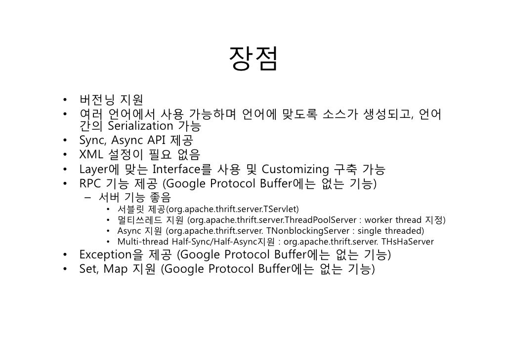 6. 6. 장점• 버전닝 지원• 여러 언어에서 사용 가능하며 언어에 맞도록 소스가 생성되고, 언어 간의 Serialization 가능• Sync, Async API 제공• XML 설정이 필요 없음• Layer에 맞는 Interface를 사용 및 Customizing 구축 가능• RPC 기능 제공 (Google Protocol Buffer에는 없는 기능) – 서버 기능 좋음 • 서블릿 제공(org.apache.thrift.server.TServlet) • 멀티쓰레드 지원 (org.apache.thrift.server.ThreadPoolServer : worker thread 지정) • Async 지원 (org.apache.thrift.server. TNonblockingServer : single threaded) • Multi-thread Half-Sync/Half-Async지원 : org.apache.thrift.server. THsHaServer• Exception을 제공 (Google Protocol Buffer에는 없는 기능)• Set, Map 지원 (Google Protocol Buffer에는 없는 기능)