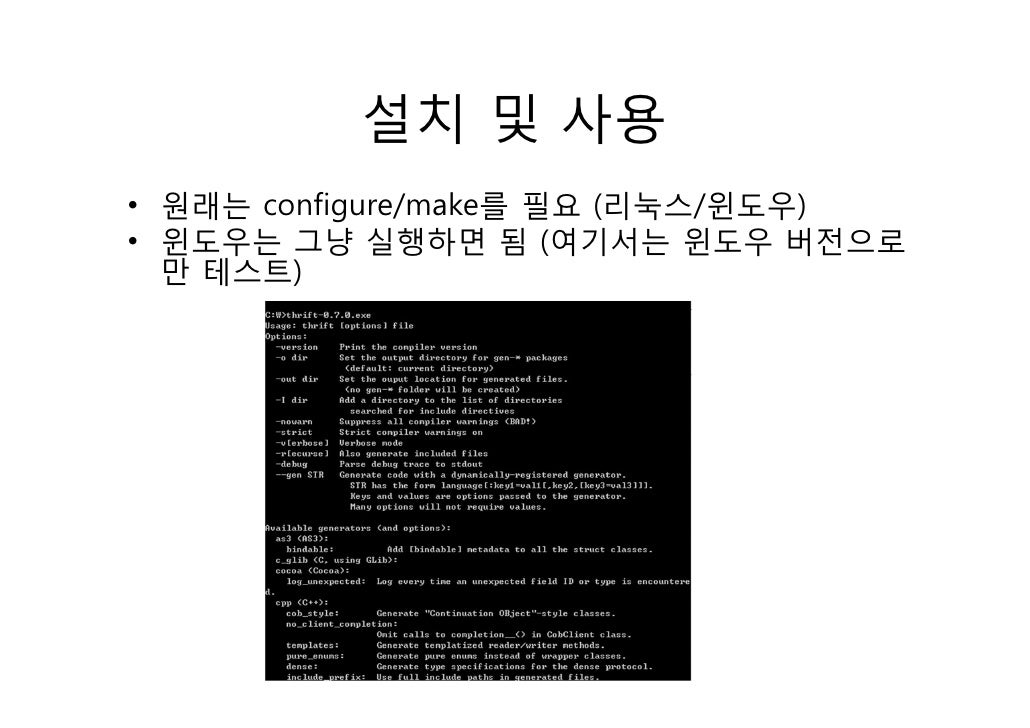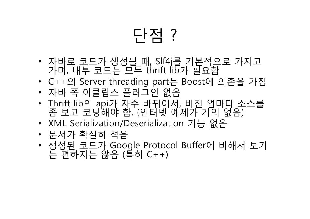 7. 7. 단점 ?• 자바로 코드가 생성될 때, Slf4j를 기본적으로 가지고 가며, 내부 코드는 모두 thrift lib가 필요함• C++의 Server threading part는 Boost에 의존을 가짐• 자바 쪽 이클립스 플러그인 없음• Thrift lib의 api가 자주 바뀌어서, 버전 업마다 소스를 좀 보고 코딩해야 함. (인터넷 예제가 거의 없음)• XML Serialization/Deserialization 기능 없음• 문서가 확실히 적음• 생성된 코드가 Google Protocol Buffer에 비해서 보기 는 편하지는 않음 (특히 C++)