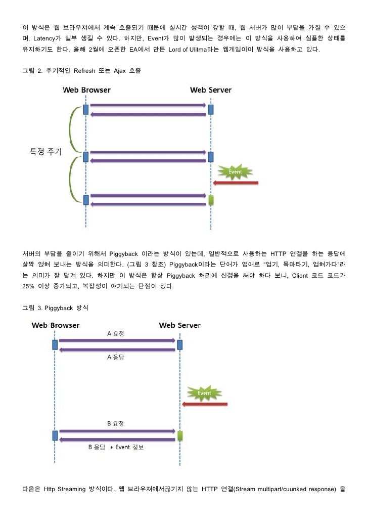 2. 2. 이 방식은 웹 브라우져에서 계속 호출되기 때문에 실시간 성격이 강할 때, 웹 서버가 많이 부담을 가질 수 있으며, Latency가 일부 생길 수 있다. 하지만, Event가 많이 발생되는 경우에는 이 방식을 사용하여 심플한 상태를유지하기도 한다. 올해 2월에 오픈한 EA에서 만든 Lord of Ulitma라는 웹게임이이 방식을 사용하고 있다.그림 2. 주기적인 Refresh 또는 Ajax 호출서버의 부담을 줄이기 위해서 Piggyback 이라는 방식이 있는데, 일반적으로 사용하는 HTTP 연결을 하는 응답에살짝 얹혀 보내는 방식을 의미한다. (그림 3 참조) Piggyback이라는 단어가 영어로 “업기, 목마타기, 업혀가다”라는 의미가 잘 담겨 있다. 하지만 이 방식은 항상 Piggyback 처리에 신경을 써야 하다 보니, Client 코드 코드가25% 이상 증가되고, 복잡성이 야기되는 단점이 있다.그림 3. Piggyback 방식다음은 Http Streaming 방식이다. 웹 브라우져에서끊기지 않는 HTTP 연결(Stream multipart/cuunked response) 을