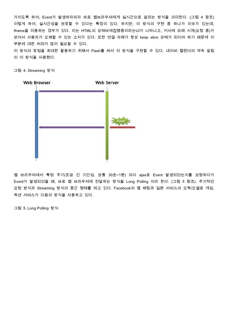 3. 3. 가지도록 하여, Event가 발생하자마자 바로 웹브라우져에게 실시간으로 알리는 방식을 의미한다. (그림 4 참조)이렇게 하여, 실시간성을 보장할 수 있다는 특징이 있다. 하지만, 이 방식의 구현 중 하나가 이슈가 있는데,Iframe을 이용하는 경우가 있다. 이는 HTML의 상태바에진행중이라는UI가 나타나고, 커서에 모래 시계(요청 중)가보여서 사용자가 오해할 수 있는 소지가 있다. 또한 연결 자체가 항상 keep alive 상태가 되어야 하기 때문에 이부분에 대한 처리가 많이 필요할 수 있다.이 방식의 장점을 최대한 활용하기 위해서 Flash를 써서 이 방식을 구현할 수 있다. 네이버 캘린더의 약속 알림이 이 방식을 사용했다.그림 4. Streaming 방식웹 브라우져에서 특정 주기(조금 긴 기간임, 보통 30초~1분) 마다 ajax로 Event 발생되었는지를 요청하다가Event가 발생되었을 때, 바로 웹 브라우져에 전달하는 방식을 Long Polling 이라 한다. (그림 5 참조). 주기적인요청 방식과 Streaming 방식의 중간 형태를 띄고 있다. Facebook의 웹 채팅과 일본 서비스의 오목/오셀로 게임,옥션 서비스가 다음의 방식을 사용하고 있다.그림 5. Long Polling 방식
