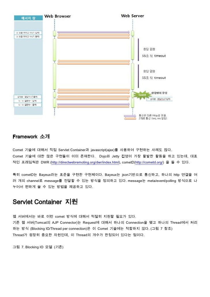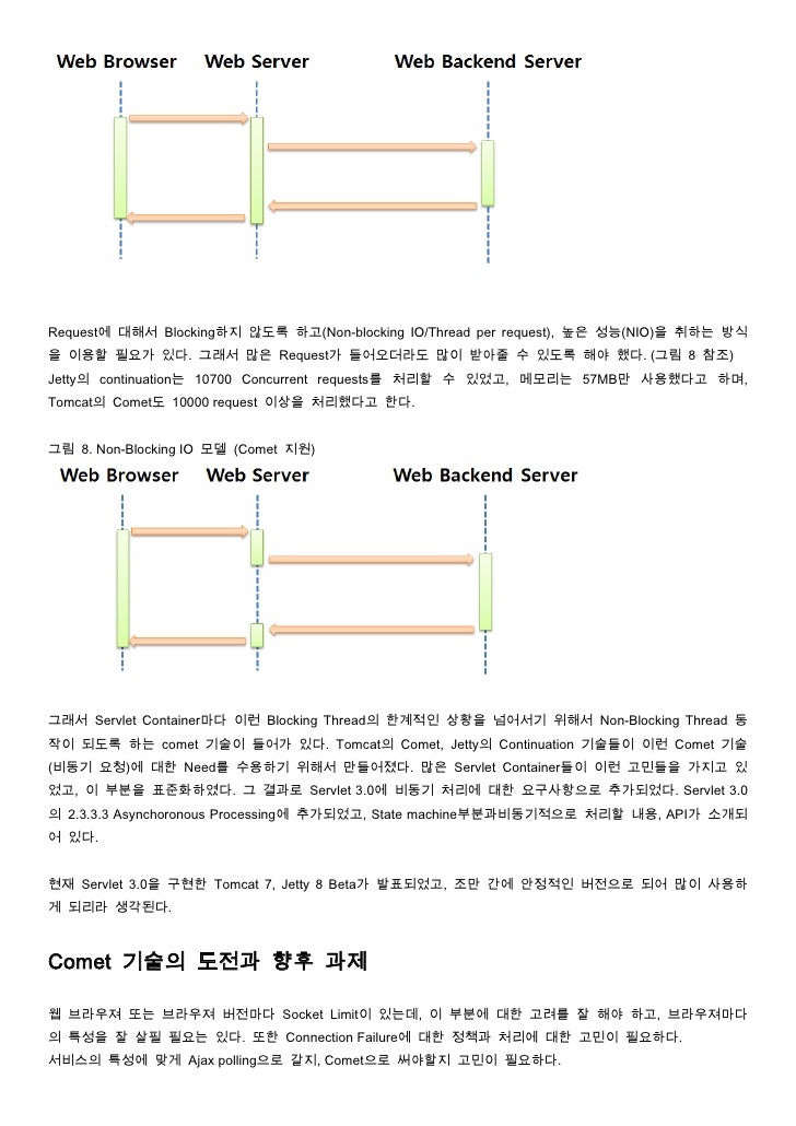 6. 6. Request에 대해서 Blocking하지 않도록 하고(Non-blocking IO/Thread per request), 높은 성능(NIO)을 취하는 방식을 이용할 필요가 있다. 그래서 많은 Request가 들어오더라도 많이 받아줄 수 있도록 해야 했다. (그림 8 참조)Jetty의 continuation는 10700 Concurrent requests를 처리할 수 있었고, 메모리는 57MB만 사용했다고 하며,Tomcat의 Comet도 10000 request 이상을 처리했다고 한다.그림 8. Non-Blocking IO 모델 (Comet 지원)그래서 Servlet Container마다 이런 Blocking Thread의 한계적인 상황을 넘어서기 위해서 Non-Blocking Thread 동작이 되도록 하는 comet 기술이 들어가 있다. Tomcat의 Comet, Jetty의 Continuation 기술들이 이런 Comet 기술(비동기 요청)에 대한 Need를 수용하기 위해서 만들어졌다. 많은 Servlet Container들이 이런 고민들을 가지고 있었고, 이 부분을 표준화하였다. 그 결과로 Servlet 3.0에 비동기 처리에 대한 요구사항으로 추가되었다. Servlet 3.0의 2.3.3.3 Asynchoronous Processing에 추가되었고, State machine부분과비동기적으로 처리할 내용, API가 소개되어 있다.현재 Servlet 3.0을 구현한 Tomcat 7, Jetty 8 Beta가 발표되었고, 조만 간에 안정적인 버전으로 되어 많이 사용하게 되리라 생각된다.Comet 기술의 도전과 향후 과제웹 브라우져 또는 브라우져 버전마다 Socket Limit이 있는데, 이 부분에 대한 고려를 잘 해야 하고, 브라우져마다의 특성을 잘 살필 필요는 있다. 또한 Connection Failure에 대한 정책과 처리에 대한 고민이 필요하다.서비스의 특성에 맞게 Ajax polling으로 갈지, Comet으로 써야할지 고민이 필요하다.