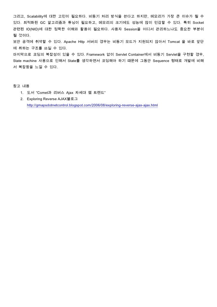 7. 7. 그리고, Scalability에 대한 고민이 필요하다. 비동기 처리 방식을 쓴다고 하지만, 메모리가 가장 큰 이슈가 될 수있다. 최적화된 GC 알고리즘과 튜닝이 필요하고, 메모리의 크기에도 성능에 많이 민감할 수 있다. 특히 Socket관련된 IO(NIO)에 대한 정확한 이해와 활용이 필요하다. 사용자 Session을 어디서 관리하느냐도 중요한 부분이될 것이다.보안 공격에 취약할 수 있다. Apache Http 서버의 경우는 비동기 모드가 지원되지 않아서 Tomcat 을 바로 앞단에 취하는 구조를 쓰일 수 있다.마지막으로 코딩의 복잡성이 있을 수 있다. Framework 없이 Servlet Container에서 비동기 Servlet을 구현할 경우,State machine 사용으로 인해서 State를 생각하면서 코딩해야 하기 때문에 그동안 Sequence 형태로 개발에 비해서 복잡함을 느낄 수 있다.참고 내용 1. 도서 “Comet과 리버스 Ajax 차세대 웹 트렌드” 2. Exploring Reverse AJAX블로그 http://gmapsdotnetcontrol.blogspot.com/2006/08/exploring-reverse-ajax-ajax.html