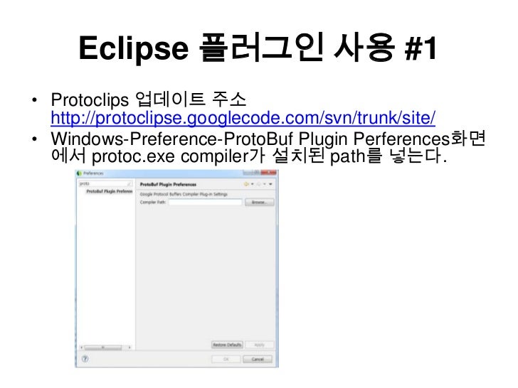 13. 13. Eclipse 플러그인 사용 #1<br />Protoclips업데이트 주소 http://protoclipse.googlecode.com/svn/trunk/site/<br />Windows-Preference-ProtoBuf Plugin Perferences화면에서 protoc.exe compiler가 설치된 path를 넣는다.<br />