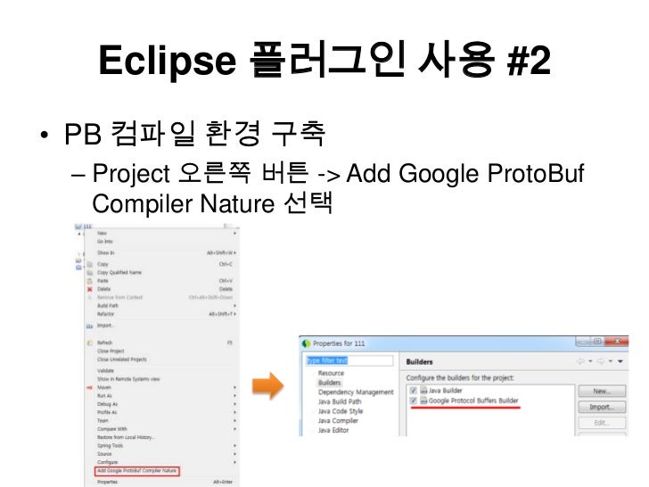 14. 14. Eclipse 플러그인 사용 #2<br />PB 컴파일 환경 구축<br />Project 오른쪽 버튼 -> Add Google ProtoBuf Compiler Nature 선택<br />