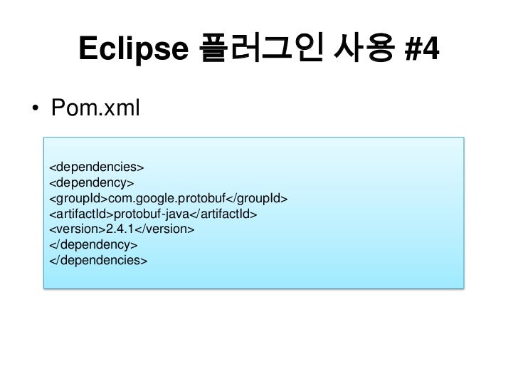 16. 16. Eclipse 플러그인 사용 #4<br />Pom.xml<br /><dependencies><br /><dependency><br /><groupId>com.google.protobuf</groupId><br /><artifactId>protobuf-java</artifactId><br /><version>2.4.1</version><br /></dependency><br /></dependencies><br />