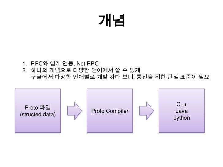 2. 2. 개념<br />RPC와 쉽게 연동, Not RPC<br />하나의 개념으로 다양한 언어에서 쓸 수 있게구글에서 다양한 언어별로 개발 하다 보니. 통신을 위한 단일 표준이 필요<br />Proto 파일<br />(structed data)<br />Proto Compiler<br />C++<br />Java<br />python<br />