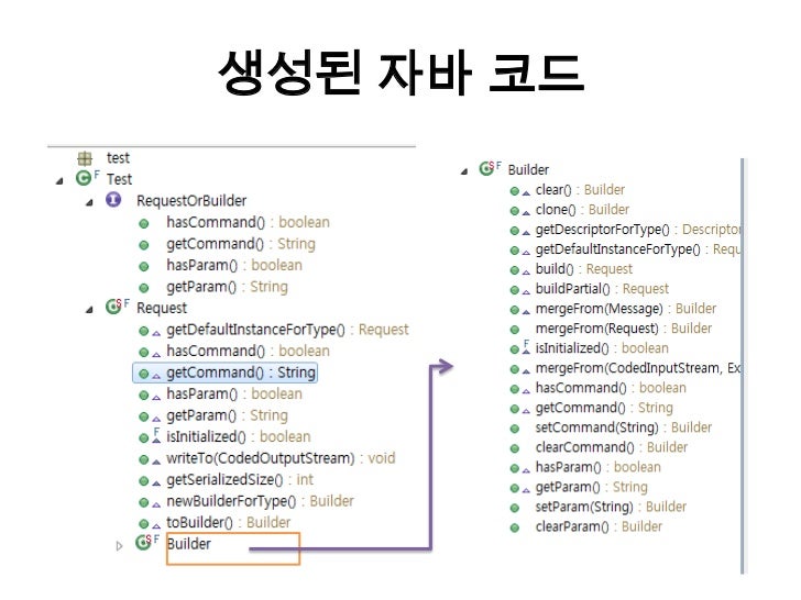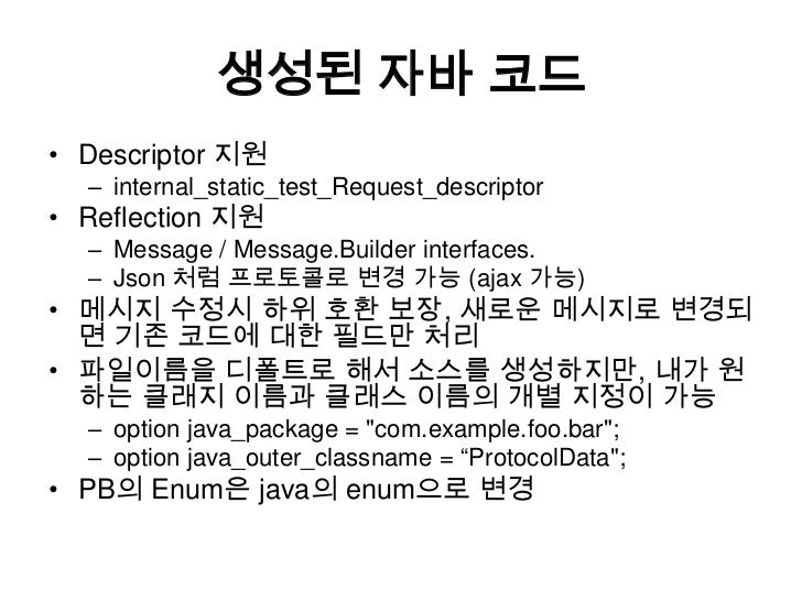 21. 21. 생성된 자바코드<br />Descriptor 지원<br />internal_static_test_Request_descriptor<br />Reflection 지원<br />Message / Message.Builder interfaces.<br />Json처럼 프로토콜로 변경 가능 (ajax가능)<br />메시지 수정시 하위 호환 보장, 새로운 메시지로 변경되면 기존 코드에 대한 필드만 처리<br />파일이름을 디폴트로 해서 소스를 생성하지만, 내가 원하는 클래지 이름과 클래스 이름의 개별 지정이 가능<br />option java_package = "com.example.foo.bar";<br />option java_outer_classname = “ProtocolData";<br />PB의 Enum은 java의 enum으로 변경<br />
