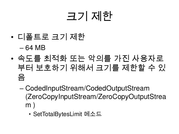 22. 22. 크기 제한<br />디폴트로 크기 제한 <br />64 MB<br />속도를 최적화 또는악의를 가진 사용자로부터 보호하기 위해서 크기를 제한할 수 있음<br />CodedInputStream/CodedOutputStream(ZeroCopyInputStream/ZeroCopyOutputStream ) <br />SetTotalBytesLimit메소드<br />
