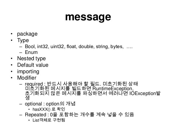 24. 24. message<br />package<br />Type<br />Bool, int32, uint32, float, double, string, bytes, ….<br />Enum<br />Nested type<br />Default value<br />importing<br />Modifier<br />required : 반드시 사용해야 할 필드. 미초기화된 상태미초기화된 메시지를 빌드하면RuntimeException, 초기화되지 않은 메시지를 파싱하면서에러나면IOException발생<br />optional : option의 개념<br />hasXXX() 로확인<br />Repeated : 0을 포함하는 개수를 계속 넣을 수 있음<br />List객체로 구현됨<br />