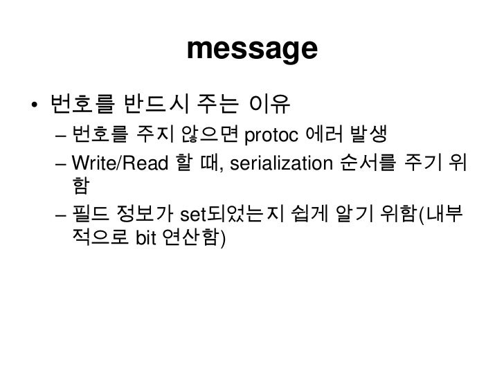25. 25. message<br />번호를 반드시 주는 이유 <br />번호를 주지 않으면 protoc에러발생<br />Write/Read 할 때, serialization 순서를 주기 위함<br />필드 정보가 set되었는지 쉽게 알기 위함(내부적으로 bit 연산함)<br />