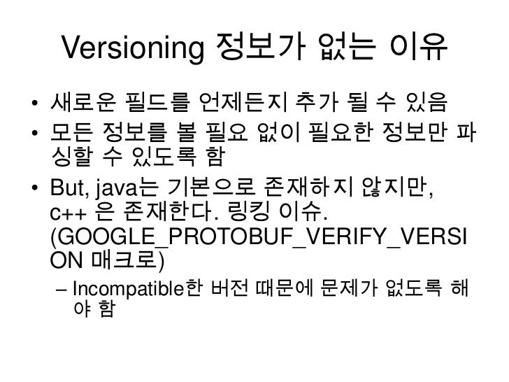 26. 26. Versioning 정보가 없는 이유<br />새로운 필드를 언제든지 추가 될 수 있음<br />모든 정보를 볼 필요 없이 필요한 정보만 파싱할 수 있도록 함<br />But, java는 기본으로 존재하지 않지만, c++은 존재한다. 링킹 이슈.(GOOGLE_PROTOBUF_VERIFY_VERSION 매크로)<br />Incompatible한 버전 때문에 문제가 없도록 해야 함<br />