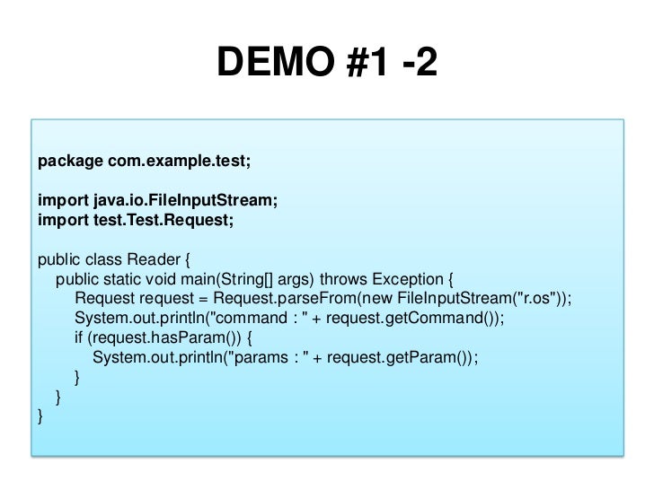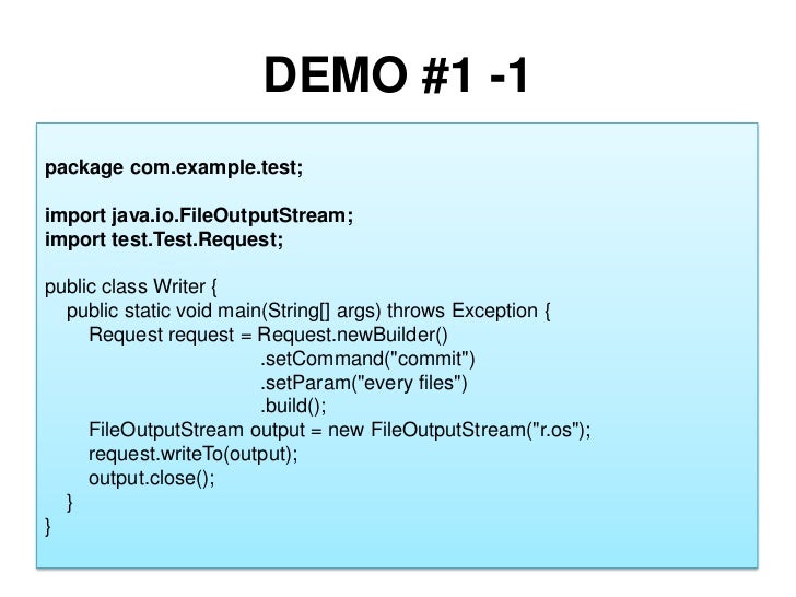 29. 29. DEMO #1 -1<br />package com.example.test;<br />import java.io.FileOutputStream;<br />import test.Test.Request;<br />public class Writer {<br /> public static void main(String[] args) throws Exception {<br /> Request request = Request.newBuilder()<br /> .setCommand("commit")<br /> .setParam("every files")<br /> .build();<br />FileOutputStreamoutput = new FileOutputStream("r.os");<br />request.writeTo(output);<br />output.close();<br /> }<br />}<br />