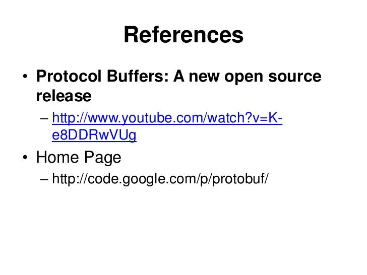3. 3. References<br />Protocol Buffers: A new open source release<br />http://www.youtube.com/watch?v=K-e8DDRwVUg<br />Home Page<br />http://code.google.com/p/protobuf/<br />