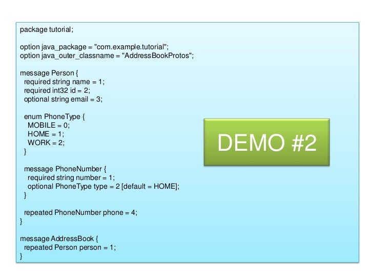 32. 32. package tutorial;<br />option java_package = "com.example.tutorial";<br />option java_outer_classname = "AddressBookProtos";<br />message Person {<br /> required string name = 1;<br /> required int32 id = 2;<br /> optional string email = 3;<br />enumPhoneType {<br /> MOBILE = 0;<br /> HOME = 1;<br /> WORK = 2;<br />}<br /> message PhoneNumber {<br /> required string number = 1;<br /> optional PhoneType type = 2 [default = HOME];<br />}<br /> repeated PhoneNumber phone = 4;<br />}<br />message AddressBook {<br /> repeated Person person = 1;<br />}<br />DEMO #2<br />