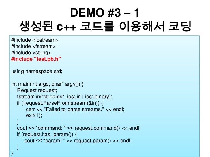 34. 34. DEMO #3 – 1생성된 c++코드를 이용해서 코딩<br />#include <iostream><br />#include <fstream><br />#include <string><br />#include "test.pb.h"<br />using namespace std; <br />int main(intargc, char* argv[]) { <br /> Request request;<br />fstream in(“streams", ios::in | ios::binary);  if (!request.ParseFromIstream(&in)) {   cerr << "Failed to parse streams." << endl;   exit(1);  }   cout << “command: " << request.command() << endl;  if (request.has_param()) {   cout << “param: " << request.param() << endl;  }<br />}<br />