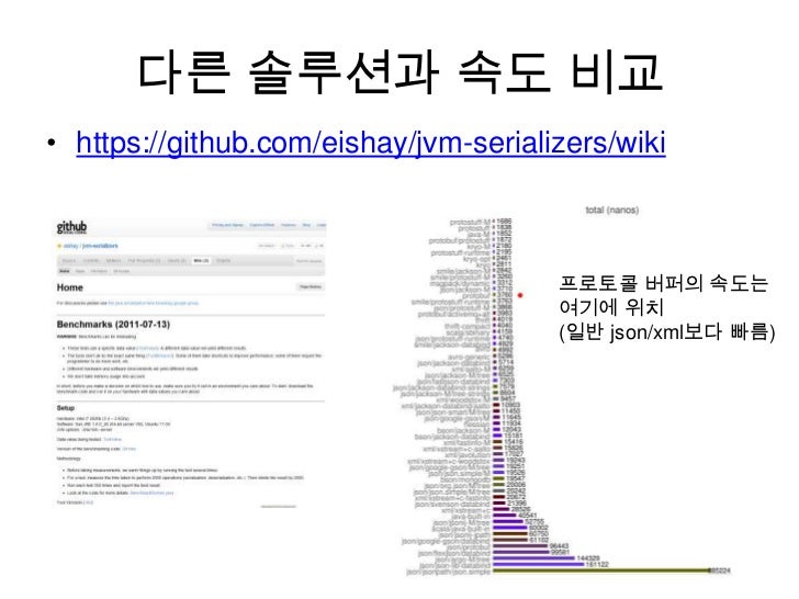 39. 39. 다른 솔루션과 속도 비교<br />https://github.com/eishay/jvm-serializers/wiki<br />프로토콜 버퍼의 속도는여기에 위치(일반 json/xml보다 빠름)<br />