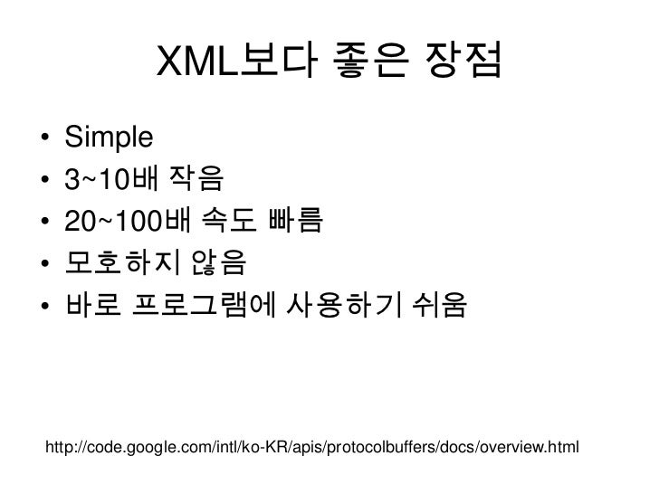 5. 5. XML보다 좋은 장점<br />Simple<br />3~10배 작음<br />20~100배 속도 빠름<br />모호하지 않음<br />바로 프로그램에 사용하기 쉬움<br />http://code.google.com/intl/ko-KR/apis/protocolbuffers/docs/overview.html<br />