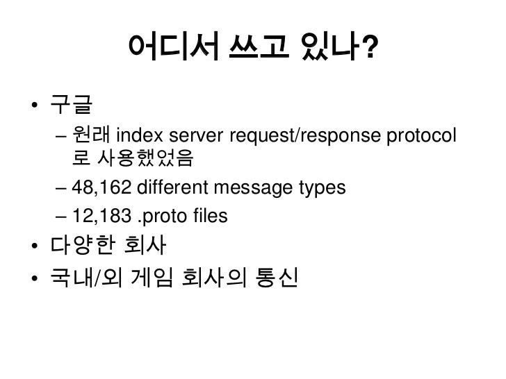 6. 6. 어디서 쓰고 있나?<br />구글<br />원래 index server request/response protocol로 사용했었음<br />48,162 different message types<br />12,183 .proto files<br />다양한 회사<br />국내/외 게임회사의 통신<br />