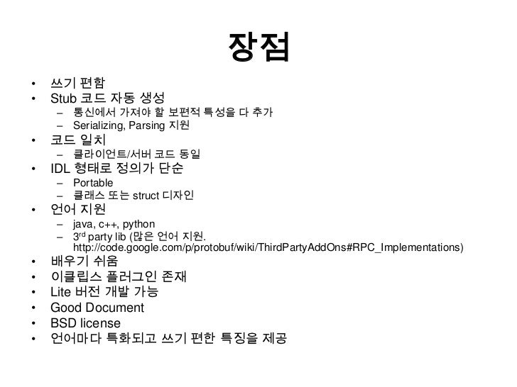 7. 7. 장점<br />쓰기 편함<br />Stub 코드 자동 생성<br />통신에서 가져야 할 보편적 특성을 다 추가<br />Serializing, Parsing 지원<br />코드 일치<br />클라이언트/서버 코드 동일<br />IDL 형태로 정의가 단순<br />Portable<br />클래스 또는 struct디자인<br />언어 지원<br />java, c++, python<br />3rd party lib (많은 언어 지원. http://code.google.com/p/protobuf/wiki/ThirdPartyAddOns#RPC_Implementations)<br />배우기 쉬움<br />이클립스플러그인 존재<br />Lite 버전 개발 가능<br />Good Document<br />BSD license<br />언어마다 특화되고 쓰기 편한 특징을 제공<br />