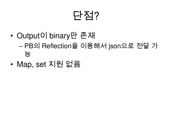 8. 8. 단점?<br />Output이 binary만 존재<br />PB의 Reflection을 이용해서 json으로 전달 가능<br />Map, set 지원 없음<br />