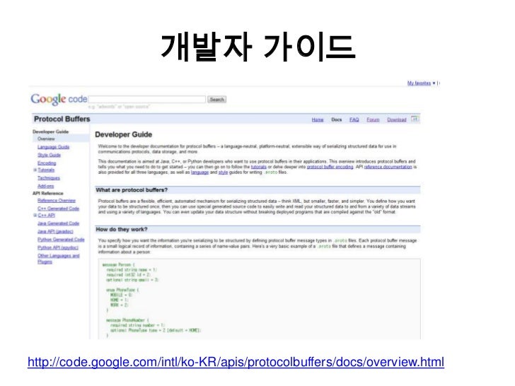 9. 9. 개발자 가이드<br />http://code.google.com/intl/ko-KR/apis/protocolbuffers/docs/overview.html<br />
