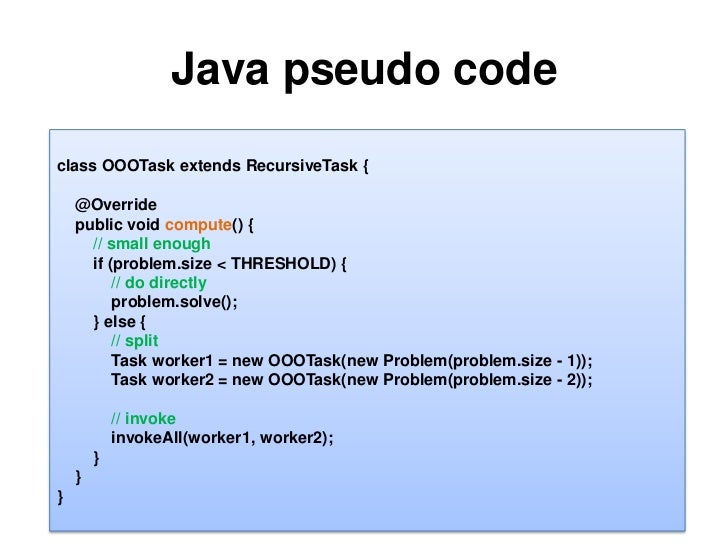 10. 10. Java pseudo code <br />10<br />class OOOTaskextends RecursiveTask {<br /> @Override<br /> public void compute() {<br />// small enough<br /> if (problem.size< THRESHOLD) { <br /> // do directly<br />problem.solve(); <br /> } else {<br />// split<br /> Task worker1 = new OOOTask(new Problem(problem.size - 1));<br /> Task worker2 = new OOOTask(new Problem(problem.size- 2));<br />// invoke<br />invokeAll(worker1, worker2);<br /> }<br /> }<br />}<br />