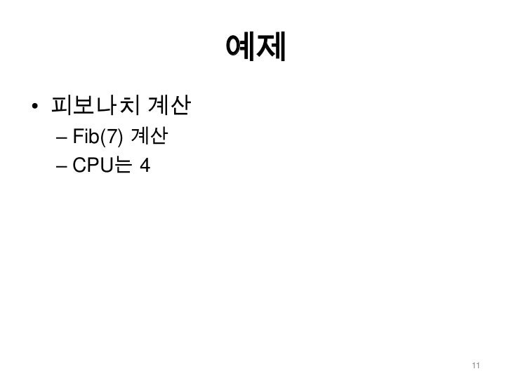 11. 11. 예제<br />피보나치 계산<br />Fib(7) 계산<br />CPU는 4<br />11<br />