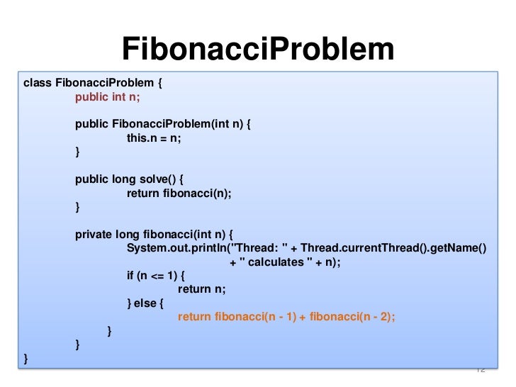 12. 12. FibonacciProblem<br />12<br />class FibonacciProblem {<br />public int n;<br /> public FibonacciProblem(int n) {<br />this.n = n;<br /> }<br /> public long solve() {<br /> return fibonacci(n);<br /> }<br /> private long fibonacci(int n) {<br />System.out.println("Thread: " + Thread.currentThread().getName()<br /> + " calculates " + n);<br /> if (n <= 1) {<br /> return n;<br />} else {<br />return fibonacci(n - 1) + fibonacci(n - 2);<br /> }<br /> }<br />}<br />