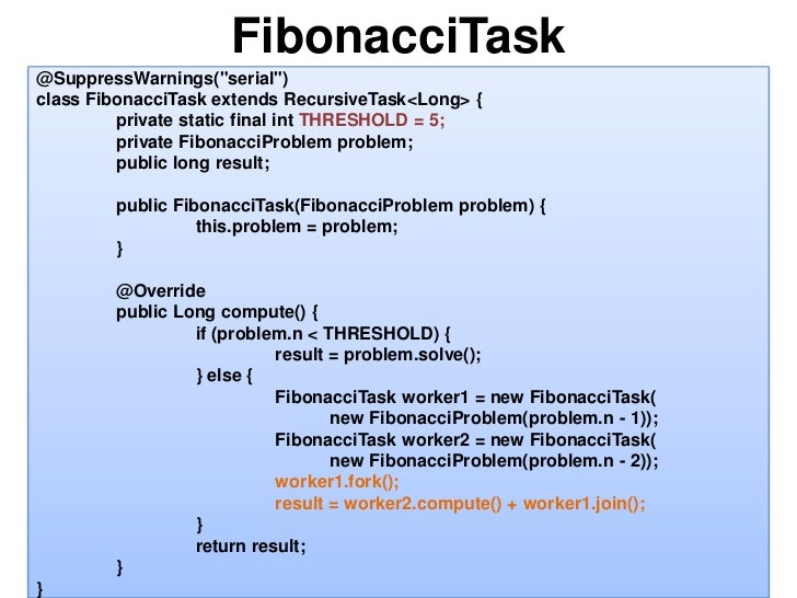 13. 13. FibonacciTask<br />13<br />@SuppressWarnings("serial")<br />class FibonacciTask extends RecursiveTask<Long> {<br /> private static final intTHRESHOLD = 5;<br /> private FibonacciProblem problem;<br /> public long result;<br /> public FibonacciTask(FibonacciProblem problem) {<br />this.problem = problem;<br /> }<br /> @Override<br /> public Long compute() {<br /> if (problem.n < THRESHOLD) {<br /> result = problem.solve();<br /> } else {<br />FibonacciTask worker1 = new FibonacciTask( new FibonacciProblem(problem.n - 1));<br />FibonacciTask worker2 = new FibonacciTask( new FibonacciProblem(problem.n - 2));<br />worker1.fork();<br /> result = worker2.compute() + worker1.join();<br /> }<br /> return result;<br /> }<br />}<br />