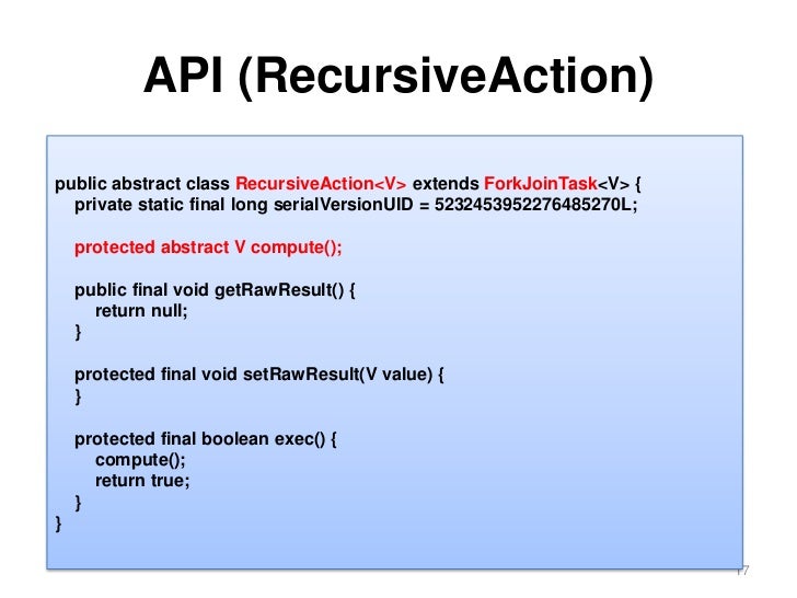 17. 17. API (RecursiveAction)<br />17<br />public abstract class RecursiveAction<V> extends ForkJoinTask<V> {<br /> private static final long serialVersionUID = 5232453952276485270L;<br /> protected abstract V compute();<br /> public final void getRawResult() { <br /> return null; <br /> }<br /> protected final void setRawResult(V value) {<br /> }<br /> protected final boolean exec() {<br /> compute();<br /> return true;<br /> }<br />}<br />