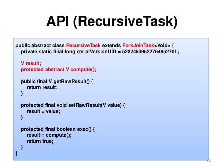 18. 18. API (RecursiveTask)<br />18<br />public abstract class RecursiveTaskextends ForkJoinTask<Void> {<br /> private static final long serialVersionUID = 5232453952276485270L;<br /> V result;<br /> protected abstract V compute();<br /> public final V getRawResult() {<br /> return result;<br /> }<br /> protected final void setRawResult(V value) {<br /> result = value;<br /> }<br /> protected final boolean exec() {<br /> result = compute();<br /> return true;<br /> }<br />}<br />