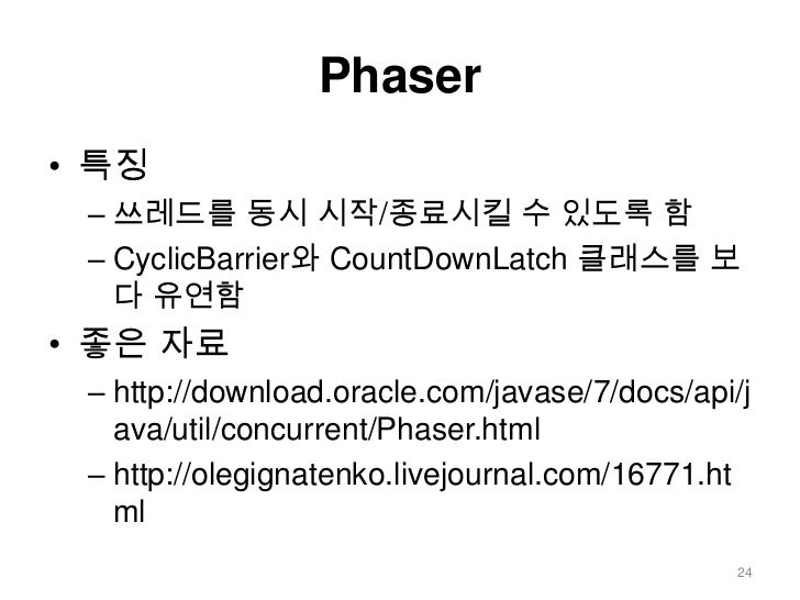 24. 24. Phaser<br />특징<br />쓰레드를 동시 시작/종료시킬 수 있도록 함<br />CyclicBarrier와 CountDownLatch클래스를 보다 유연함<br />좋은 자료<br />http://download.oracle.com/javase/7/docs/api/java/util/concurrent/Phaser.html<br />http://olegignatenko.livejournal.com/16771.html<br />24<br />