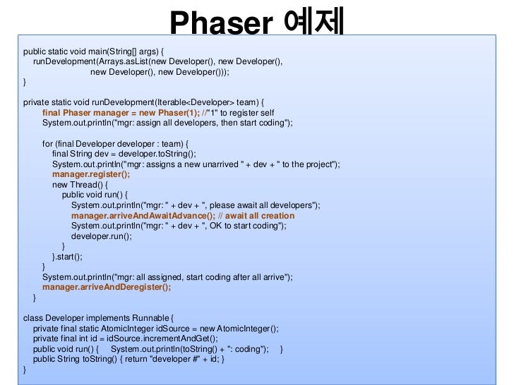 25. 25. Phaser예제<br />25<br />public static void main(String[] args) {<br />runDevelopment(Arrays.asList(new Developer(), new Developer(), <br /> new Developer(), new Developer()));<br />}<br />private static void runDevelopment(Iterable<Developer> team) {<br /> final Phasermanager = new Phaser(1); //"1" to register self<br />System.out.println("mgr: assign all developers, then start coding");<br /> for (final Developer developer : team) {<br /> final String dev = developer.toString();<br />System.out.println("mgr: assigns a new unarrived " + dev + " to the project");<br />manager.register();<br /> new Thread() {<br /> public void run() {<br />System.out.println("mgr: " + dev + ", please await all developers");<br />manager.arriveAndAwaitAdvance(); // await all creation<br />System.out.println("mgr: " + dev + ", OK to start coding");<br />developer.run();<br />}<br /> }.start();<br />}<br />System.out.println("mgr: all assigned, start coding after all arrive");<br />manager.arriveAndDeregister();<br />}<br />class Developer implements Runnable {<br /> private final static AtomicIntegeridSource = new AtomicInteger();<br /> private final int id = idSource.incrementAndGet();<br /> public void run() { System.out.println(toString() + ": coding"); }<br /> public String toString() { return "developer #" + id; }<br />} <br />