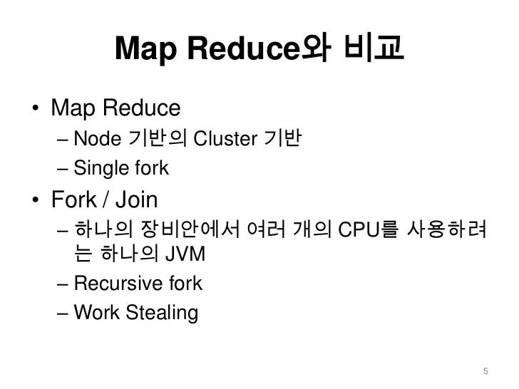 5. 5. Map Reduce와 비교<br />Map Reduce<br />Node 기반의 Cluster 기반<br />Single fork<br />Fork / Join<br />하나의장비안에서 여러 개의 CPU를 사용하려는 하나의 JVM<br />Recursive fork<br />Work Stealing<br />5<br />