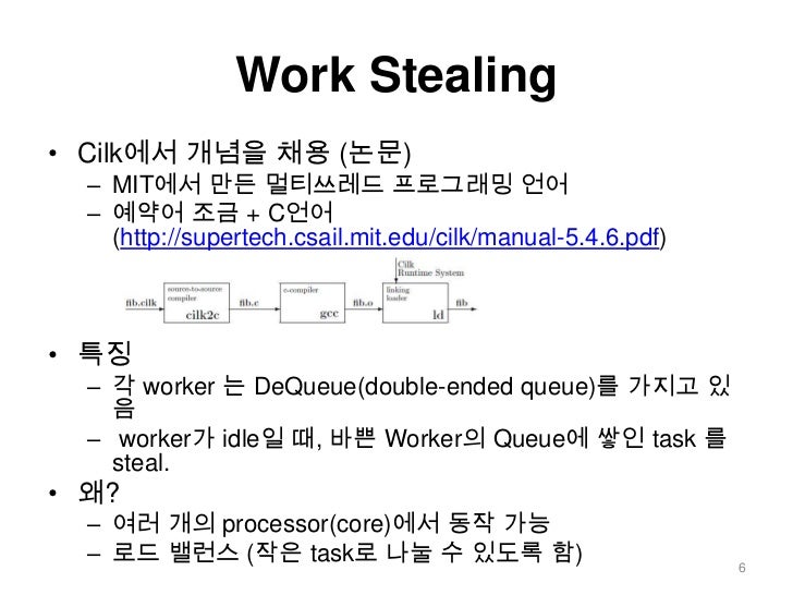 6. 6. Work Stealing<br />Cilk에서개념을 채용 (논문)<br />MIT에서 만든 멀티쓰레드 프로그래밍 언어<br />예약어 조금 + C언어(http://supertech.csail.mit.edu/cilk/manual-5.4.6.pdf)<br />특징<br />각 worker 는 DeQueue(double-ended queue)를 가지고 있음 <br /> worker가 idle일 때, 바쁜 Worker의 Queue에 쌓인 task 를 steal.<br />왜?<br />여러 개의 processor(core)에서 동작 가능<br />로드 밸런스 (작은 task로 나눌 수 있도록 함)<br />6<br />
