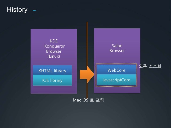21. 21. WebKit포팅시에는WebCore와 JavaScriptCore만 사용</li></li></ul><li>History<br />Safari<br />Browser<br />KDE<br />Konqueror<br />Browser<br />(Linux)<br />오픈 소스화<br />WebCore<br />KHTML library<br />JavascriptCore<br />KJS library<br /> Mac OS 로포팅<br />
