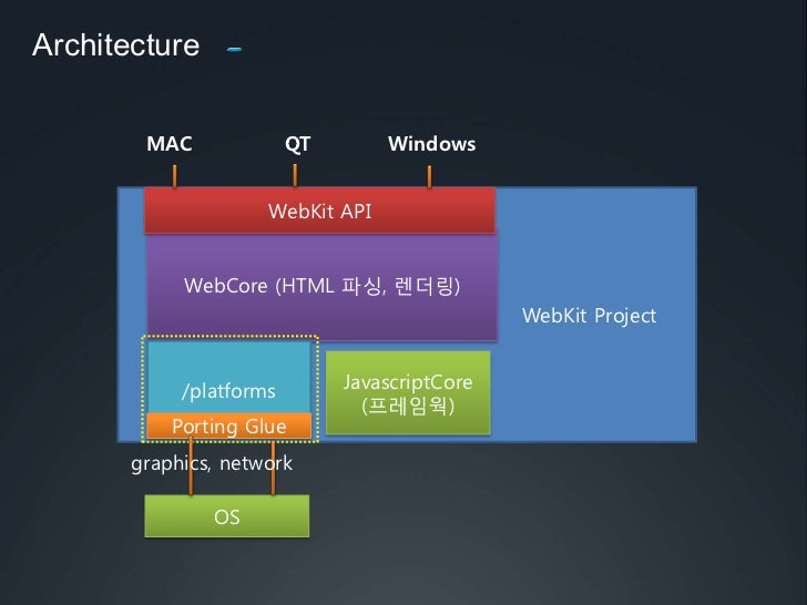 22. 22. Architecture<br />QT<br />MAC<br />Windows<br />WebKit Project<br />WebKit API <br />WebCore (HTML 파싱, 렌더링)<br />/platforms<br />JavascriptCore<br />(프레임웍)<br />Porting Glue<br />graphics, network<br />OS<br />