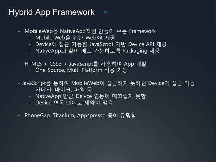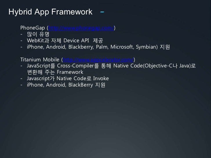 32. 32. PhoneGap, Titanium, Appspresso등이 유명함</li></li></ul><li>Hybrid App Framework<br />PhoneGap (http://www.phonegap.com/)<br /><ul><li>많이 유명