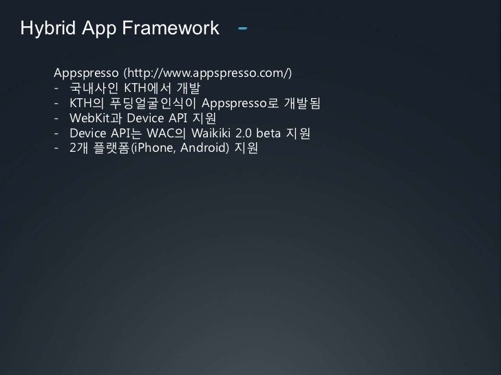 36. 36. iPhone, Android, BlackBerry 지원 </li></li></ul><li>Hybrid App Framework<br />Appspresso (http://www.appspresso.com/) <br /><ul><li>국내사인 KTH에서 개발