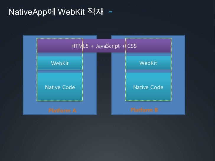 40. 40. 2개 플랫폼(iPhone, Android) 지원</li></li></ul><li>NativeApp에 WebKit적재<br />HTML5 + JavaScript + CSS<br />WebKit<br />WebKit<br />Native Code<br />Native Code<br />Platform B<br />Platform A<br />