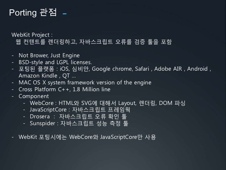 11. 11. Porting 관점<br />WebKit Project :<br />웹 컨텐트를렌더링하고, 자바스크립트 오류를 검증 툴을 포함<br /><ul><li>Not Brower, Just Engine
