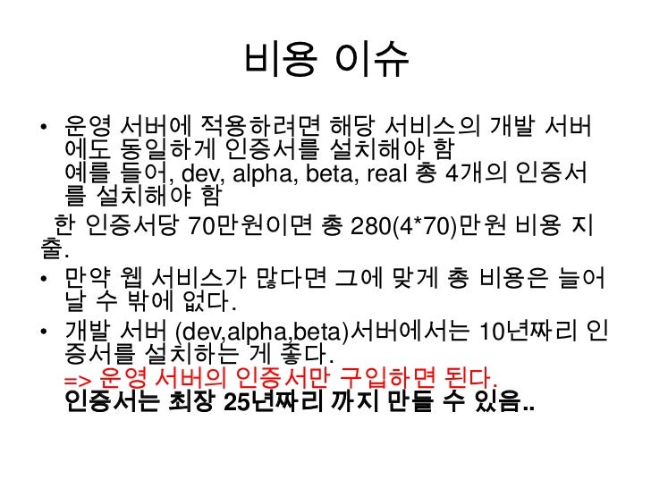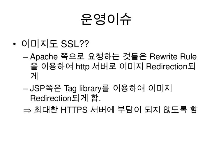 10. 10. 운영이슈<br />이미지도 SSL??<br />Apache 쪽으로 요청하는 것들은 Rewrite Rule을 이용하여 http 서버로 이미지 Redirection되게<br />JSP쪽은 Tag library를 이용하여 이미지 Redirection되게 함. <br /><ul><li> 최대한 HTTPS 서버에 부담이 되지 않도록 함</li></li></ul><li>비용 이슈<br />운영 서버에 적용하려면 해당 서비스의 개발 서버에도 동일하게 인증서를 설치해야 함예를 들어, dev, alpha, beta, real 총 4개의 인증서를 설치해야 함<br /> 한 인증서당 70만원이면 총 280(4*70)만원 비용 지출. <br /><ul><li>만약 웹 서비스가 많다면 그에 맞게 총 비용은 늘어날 수 밖에 없다.