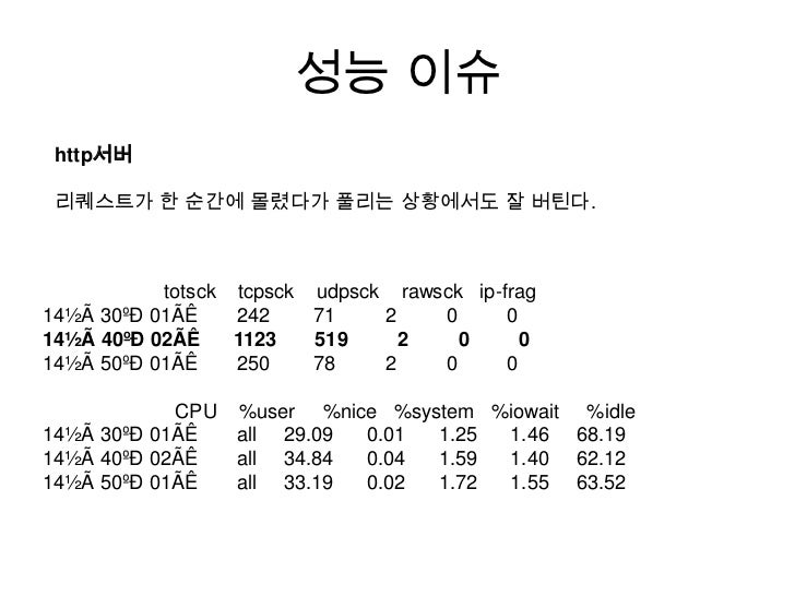 13. 13. 성능 이슈<br />http서버<br />리퀘스트가 한 순간에 몰렸다가 풀리는 상황에서도잘 버틴다.<br />                      totsck    tcpsck    udpsck    rawsck   ip-frag<br />14½Ã 30ºÐ 01ÃÊ       242        71         2         0         0<br />14½Ã 40ºÐ 02ÃÊ      1123       519         2         0         0<br />14½Ã 50ºÐ 01ÃÊ       250        78         2         0         0<br /> <br />                        CPU    %user     %nice   %system   %iowait     %idle<br />14½Ã 30ºÐ 01ÃÊ       all     29.09      0.01      1.25      1.46     68.19<br />14½Ã 40ºÐ 02ÃÊ       all     34.84      0.04      1.59      1.40     62.12<br />14½Ã 50ºÐ 01ÃÊ       all     33.19      0.02      1.72      1.55     63.52<br /> <br />