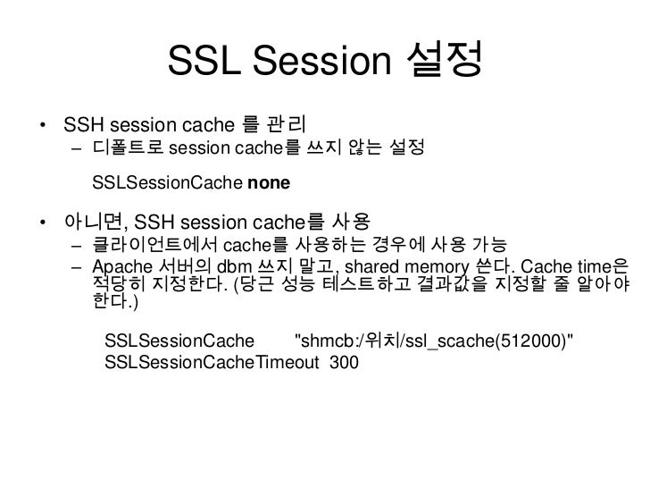 14. 14. SSL Session 설정<br />SSH session cache 를 관리<br />디폴트로 session cache를 쓰지 않는 설정SSLSessionCachenone<br />아니면, SSH session cache를 사용<br />클라이언트에서 cache를 사용하는 경우에 사용 가능<br />Apache 서버의 dbm쓰지 말고, shared memory 쓴다. Cache time은 적당히 지정한다. (당근 성능 테스트하고 결과값을 지정할 줄 알아야 한다.)<br />SSLSessionCache        "shmcb:/위치/ssl_scache(512000)"<br />SSLSessionCacheTimeout  300<br />