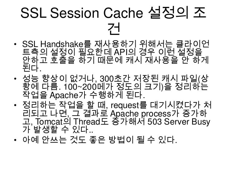 15. 15. SSL Session Cache 설정의 조건<br />SSL Handshake를 재사용하기 위해서는 클라이언트측의설정이 필요한데 API의 경우 이런 설정을 안하고 호출을 하기 때문에 캐시 재사용을 안 하게 된다.<br />성능 향상이 없거나, 300초간 저장된 캐시 파일(상황에 다름. 100~200메가 정도의크기)을 정리하는 작업을 Apache가 수행하게 된다. <br />정리하는 작업을 할 때, request를 대기시켰다가 처리되고 나면, 그 결과로 Apache process가 증가하고, Tomcat의 Thread도 증가해서 503 Server Busy가 발생할 수 있다..<br />아예 안쓰는 것도 좋은 방법이 될 수 있다.<br />