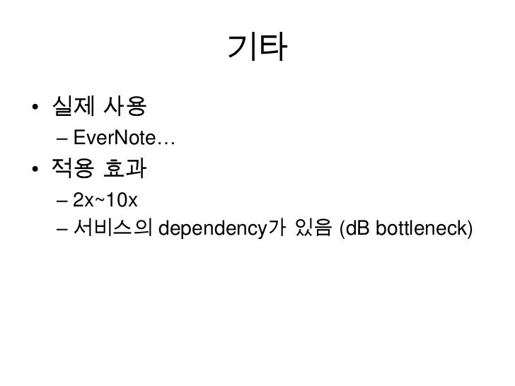 18. 18. 기타<br />실제 사용<br />EverNote…<br />적용 효과<br />2x~10x<br />서비스의 dependency가 있음 (dB bottleneck)<br />