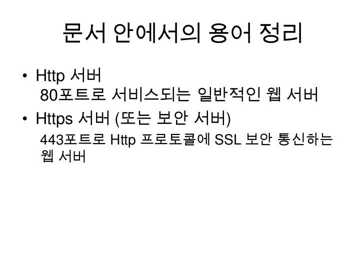 2. 2. 문서 안에서의 용어 정리<br />Http 서버 80포트로 서비스되는 일반적인 웹 서버<br />Https 서버 (또는 보안 서버)<br />443포트로 Http 프로토콜에 SSL 보안 통신하는 웹 서버<br />