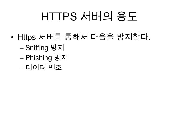4. 4. HTTPS 서버의 용도<br />Https 서버를 통해서 다음을 방지한다.<br />Sniffing 방지<br />Phishing 방지<br />데이터 변조<br />