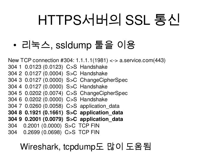 6. 6. HTTPS서버의 SSL 통신<br />리눅스, ssldump툴을 이용<br />New TCP connection #304: 1.1.1.1(1981) <-> a.service.com(443)<br />304 1  0.0123 (0.0123)  C>S  Handshake<br />304 2  0.0127 (0.0004)  S>C  Handshake<br />304 3  0.0127 (0.0000)  S>C  ChangeCipherSpec<br />304 4  0.0127 (0.0000)  S>C  Handshake<br />304 5  0.0202 (0.0074)  C>S  ChangeCipherSpec<br />304 6  0.0202 (0.0000)  C>S  Handshake<br />304 7  0.0260 (0.0058)  C>S  application_data<br />304 8  0.1921 (0.1661)  S>C  application_data<br />304 9  0.2001 (0.0079)  S>C  application_data<br />304    0.2001 (0.0000)  S>C  TCP FIN<br />304    0.2699 (0.0698)  C>S  TCP FIN<br />Wireshark, tcpdump도 많이 도움됨<br />